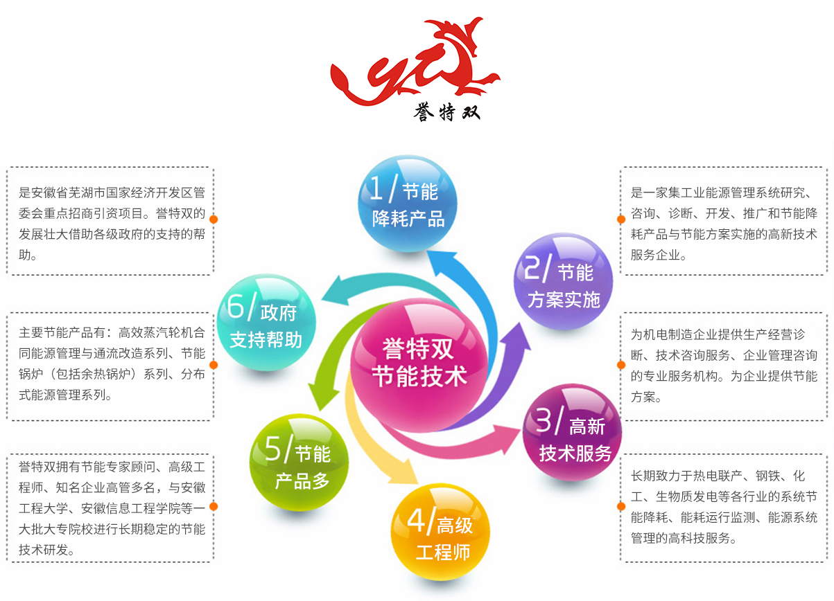 安徽譽(yù)特雙節(jié)能技術(shù)有限公司,成立于2013年11月,注冊(cè)資金5000萬(wàn)元,位于中國(guó)(安 徽)自由貿(mào)易試驗(yàn)區(qū)蕪湖片區(qū)龍山園區(qū)。 公司主針對(duì)化工、鋼鐵、焦化、熱電聯(lián)供、造紙、印染、制糖、冶金、建材等大型生產(chǎn)制造高耗能工業(yè)領(lǐng)域熱工系統(tǒng),致力于工業(yè)蒸汽輪機(jī)通流結(jié)構(gòu)技改提效、變工況運(yùn)行改造、余熱余壓資源綜合利用節(jié)能技術(shù)的研發(fā)與應(yīng)用,進(jìn)行的系統(tǒng)研究、咨詢(xún)、診斷、開(kāi)發(fā)、推廣、投資、建設(shè)、運(yùn)營(yíng),包括節(jié)能降耗產(chǎn)品生...