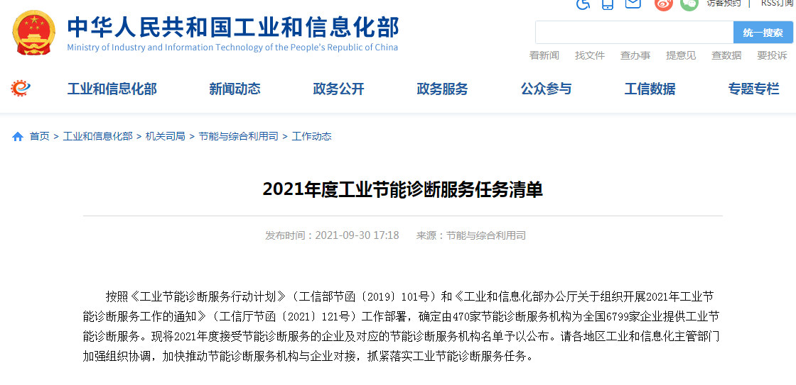根據(jù)2021年9月30日,國家工業(yè)和信息化部《工業(yè)節(jié)能診斷服務(wù)行動(dòng)計(jì)劃》(工信部節(jié)函〔2019〕101號)和《工業(yè)和信息化部辦公廳關(guān)于組織開展2021年工業(yè)節(jié)能診斷服務(wù)工作的通知》(工信廳節(jié)函﹝2021﹞121號)工作部署。