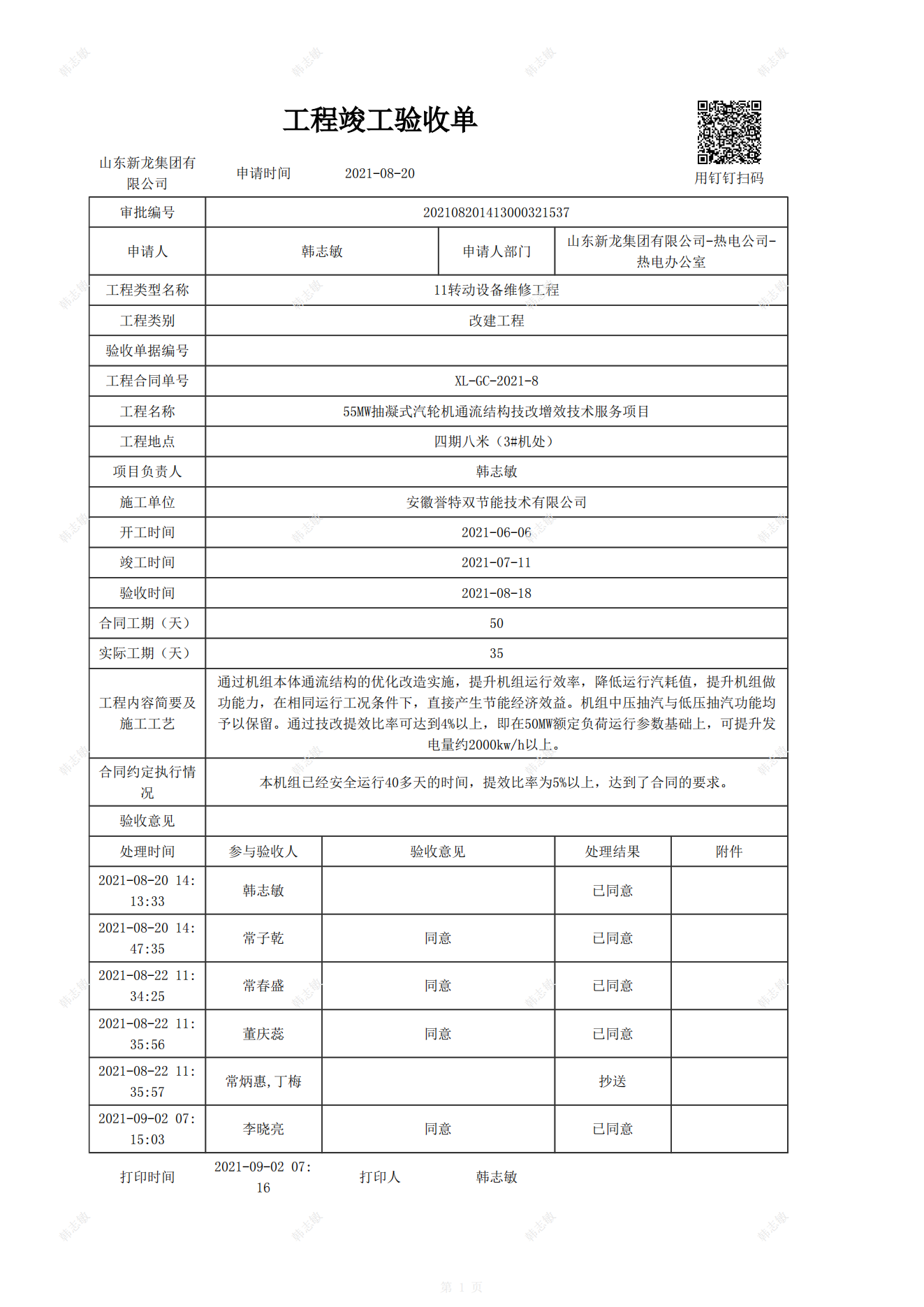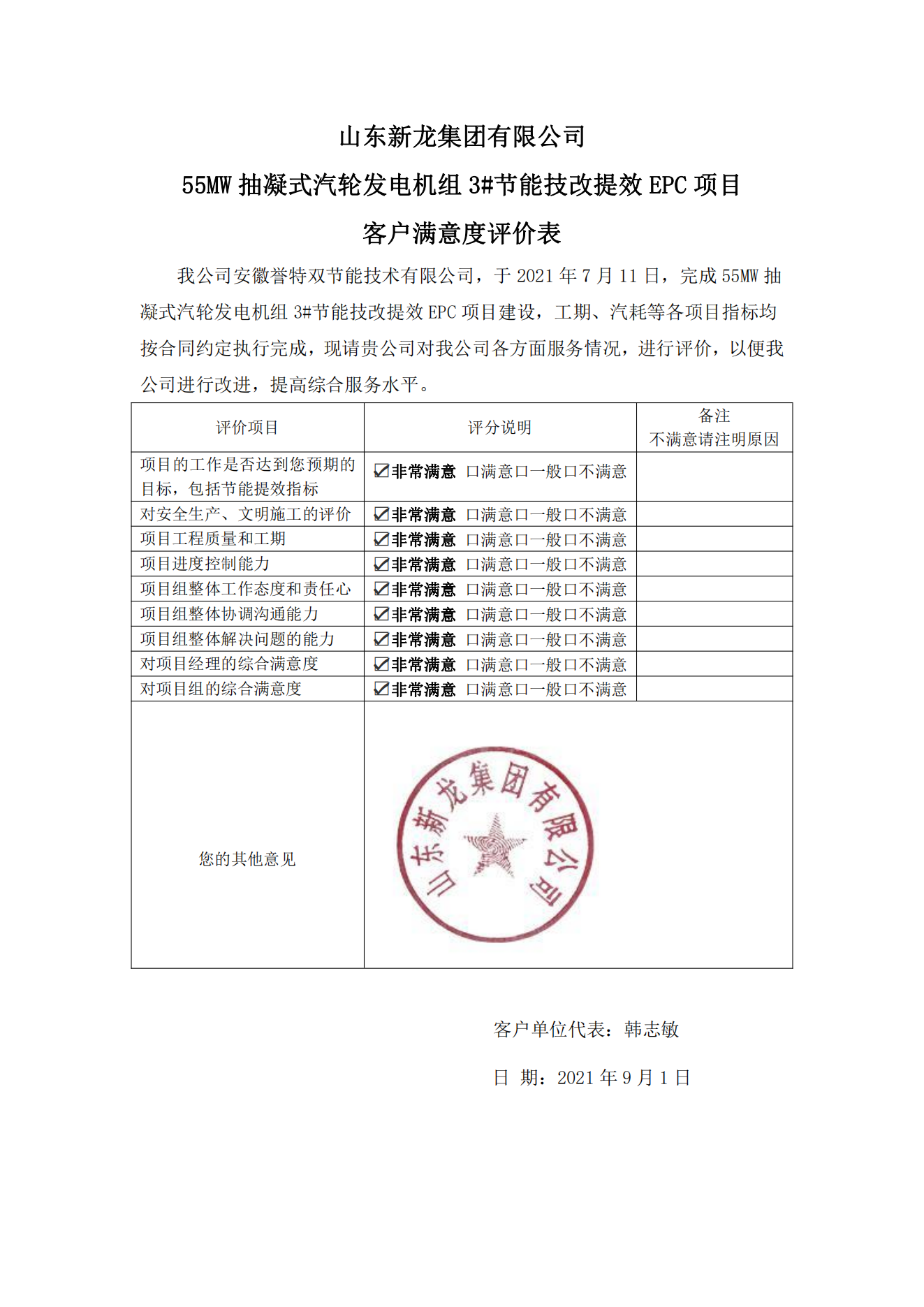 我公司EPC總包節(jié)能改造服務(wù)項目——山東新龍集團55MW高壓抽凝式汽輪機組通流改造節(jié)能提效項目順利通過工程驗收,機組各項技術(shù)指標均正常、穩(wěn)定,綜合節(jié)能提效比例達5%以上,實測值7.3%;