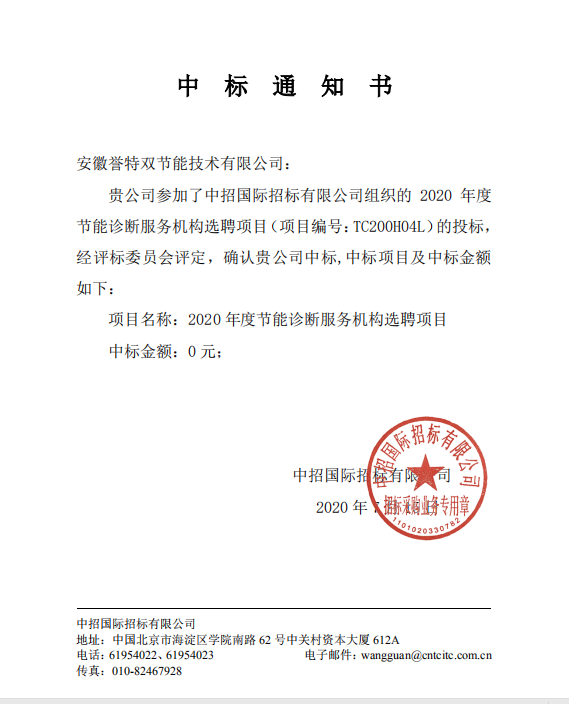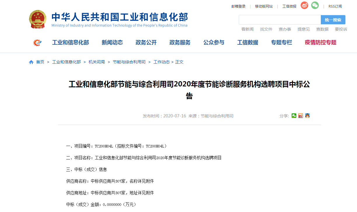 2020年7月15日,公司成功中標工業(yè)和信息化部節(jié)能與綜合利用司“2020年度國家節(jié)能診斷服務機構(gòu)選聘項目合格供應商”.