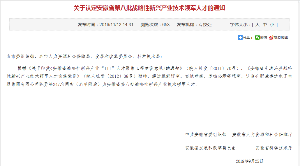 2019年11月12日,經(jīng)中共安徽省委組織部、安徽省人力資源和社會(huì)保障廳、安徽省發(fā)展和改革委員會(huì)、安徽省科學(xué)技術(shù)廳四部門聯(lián)合發(fā)文“經(jīng)過(guò)組織評(píng)審、實(shí)地考察、復(fù)核公示等程序,認(rèn)定安徽省第八批戰(zhàn)略性新興產(chǎn)業(yè)技術(shù)領(lǐng)軍人才名單,正式予以公布?!?/span>