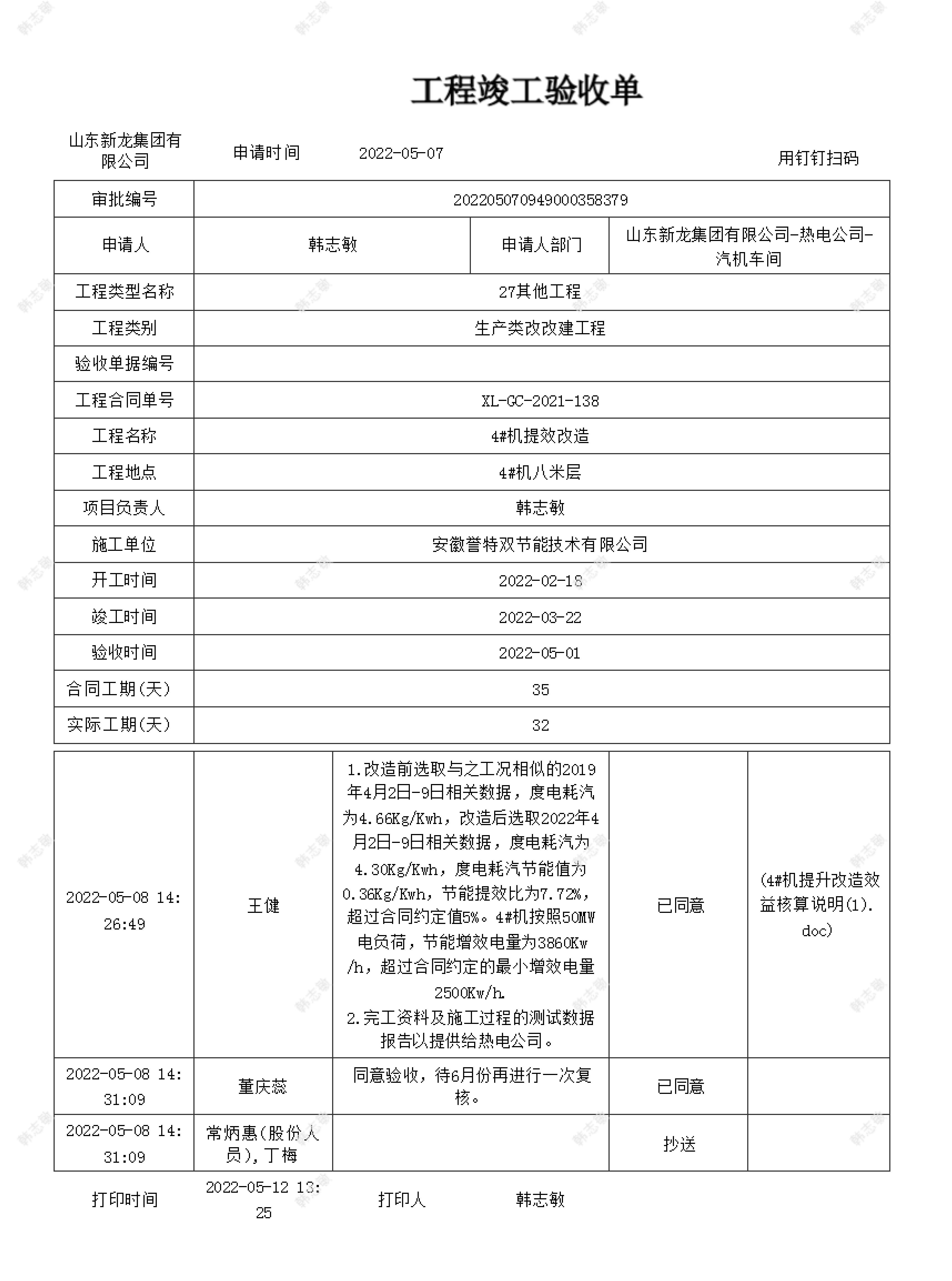 我安徽譽(yù)特雙節(jié)能技術(shù)有限公司,承接的山東新龍集團(tuán)55MW汽輪機(jī)4#機(jī)組通流結(jié)構(gòu)技改提效項(xiàng)目,自2022年3月25日一次性開機(jī)沖轉(zhuǎn)成功并網(wǎng)以來,當(dāng)前已順利運(yùn)行42天,機(jī)組各項(xiàng)參數(shù)指標(biāo)均正常、穩(wěn)定。項(xiàng)目于近日順利通過工程驗(yàn)收,實(shí)測(cè)同等工況條件下,節(jié)能提效比例達(dá)7.72%,遠(yuǎn)超合同約定的5%考核指標(biāo),同時(shí)合同約定改造工期為35天,實(shí)際完成為32天,節(jié)約三天時(shí)間。