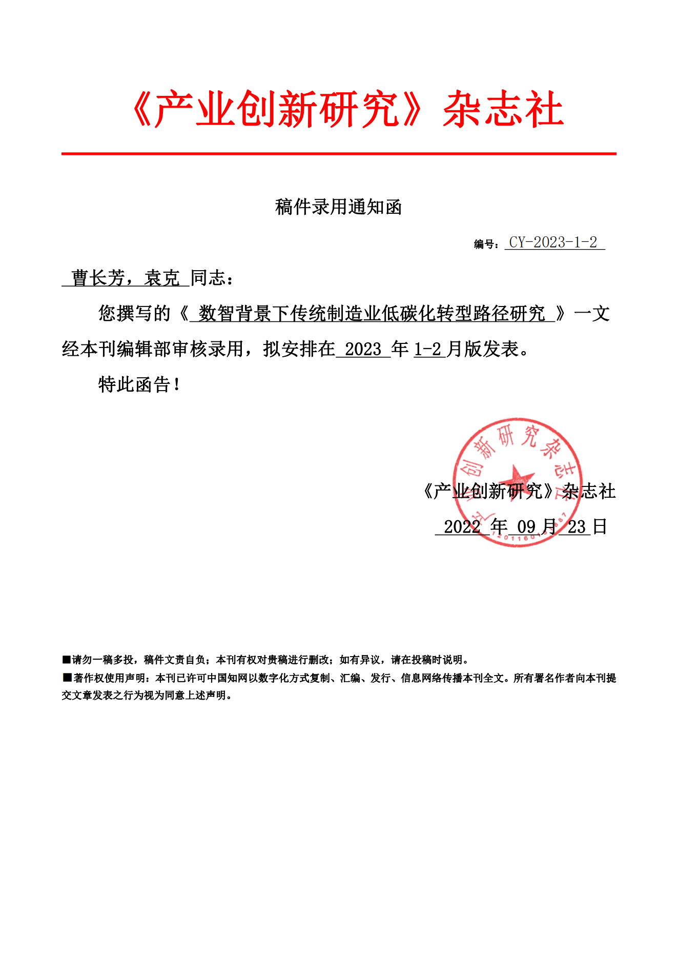 近日,我公司參與撰寫(xiě)的專業(yè)學(xué)術(shù)論文《數(shù)智背景下傳統(tǒng)制造業(yè)低碳化轉(zhuǎn)型路徑研究》,經(jīng)國(guó)家新聞出版總署的部級(jí)期刊《產(chǎn)業(yè)創(chuàng)新研究》雜志社審核通過(guò)并予以錄用,擬安排在2023年1-2月版發(fā)表,在此表示熱烈祝賀。