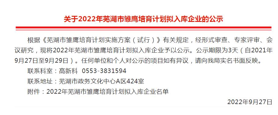 近日,經(jīng)市科技局統(tǒng)一組織申報(bào)、形式審查、專家評審、會議研究通過,公布2022年度蕪湖市雛鷹培育計(jì)劃入庫名單,我公司喜獲認(rèn)定。