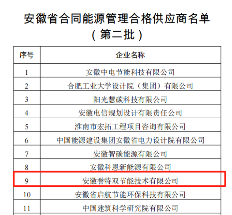 近日,安徽省發(fā)改委發(fā)布第二批安徽省節(jié)能減煤降碳診斷服務(wù)機構(gòu)和合同能源管理合格供應(yīng)商名單,本次節(jié)能減煤降碳診斷服務(wù)機構(gòu)共計擇優(yōu)評選出29家企業(yè),合同能源管理合格供應(yīng)商共計擇優(yōu)評選出14家企業(yè),我公司雙雙榮列榜單,在此表示熱烈祝賀。