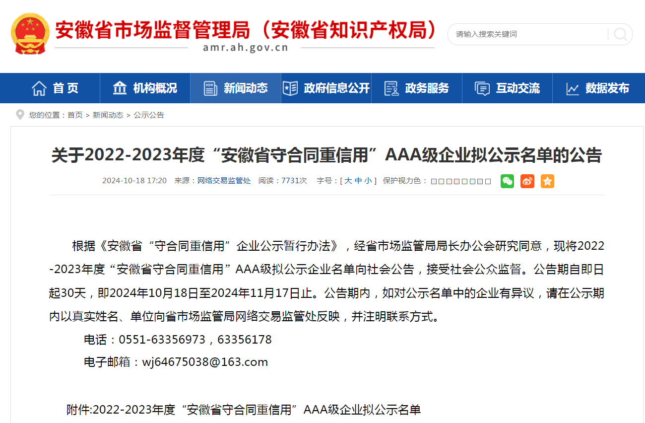 為推動企業(yè)誠信建設(shè)、賦能企業(yè)高質(zhì)量發(fā)展,安徽省市場監(jiān)督管理局經(jīng)統(tǒng)一部署,組織開展了2024年度安徽省“守合同重信用”企業(yè)評選公示活動,通過對申報的企業(yè)進行資料復(fù)核、征信查詢、合同執(zhí)行、業(yè)績數(shù)量、市場口碑、企業(yè)形象、行業(yè)影響等各方面進行評估,經(jīng)嚴(yán)格的實地核實、綜合評判,遴選出一批行業(yè)影響力大、品牌信用度高的經(jīng)營發(fā)展態(tài)勢良好的企業(yè),我公司榮幸被評選為安徽省2022-2023年度“守合同重信用AAA級企業(yè)”,省內(nèi)平均每個地級市全行業(yè)僅在30家左右,含金量非常高,在此表示熱烈祝賀!