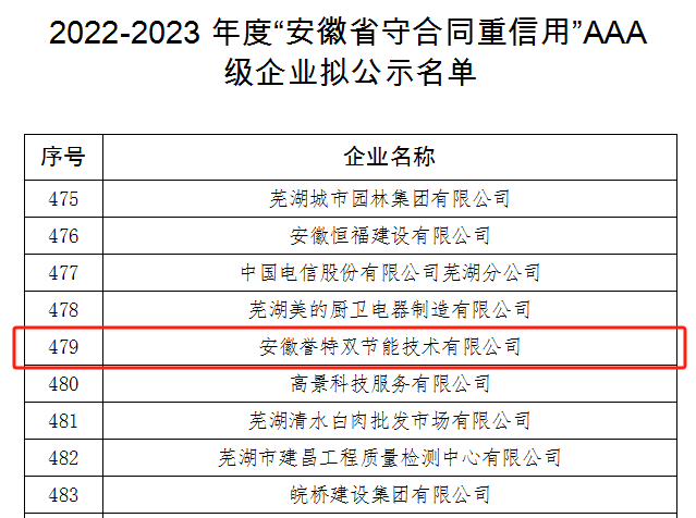 信譽是企業(yè)長期穩(wěn)定發(fā)展的根基,反映企業(yè)在運營過程中的經(jīng)營理念和發(fā)展宗旨,信譽程度在對外商務(wù)往來中已成為重要環(huán)節(jié)。本次入選安徽省守合同重信用AAA級企業(yè),綜合體現(xiàn)了我公司財務(wù)狀況良好、企業(yè)文化優(yōu)秀、社會信譽度高,在經(jīng)營過程中無違法亂紀(jì)行為、無不良信用記錄等,樹立了良好的標(biāo)桿示范形象,公司也將繼續(xù)秉承守合同重信用經(jīng)營理念,為國家節(jié)能環(huán)保事業(yè)做出更大的貢獻(xiàn),一諾千金,合作共贏!
