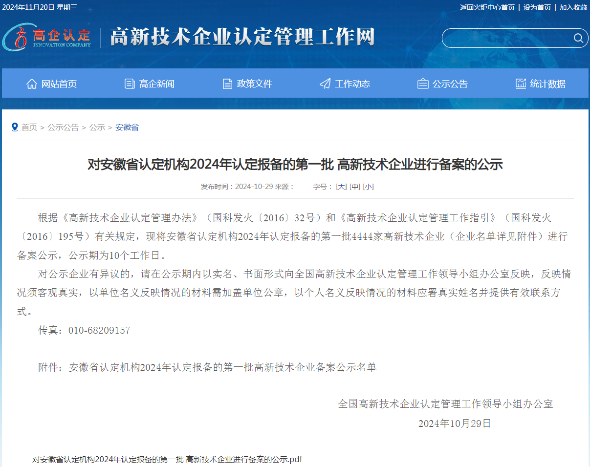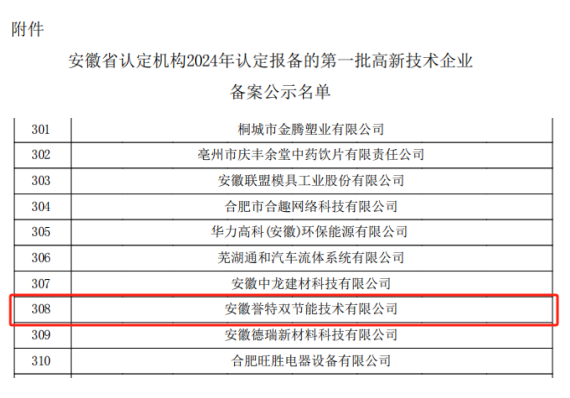 近期,全國高新技術(shù)企業(yè)認定管理工作領(lǐng)導(dǎo)小組辦公室公布了安徽省2024年認定報備的第一批高新技術(shù)企業(yè),我公司名列其中,在此表示祝賀!同時這也是公司連續(xù)第三次被認定為國家高新技術(shù)企業(yè)。