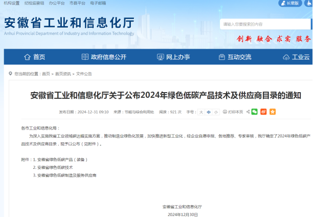 公司三項(xiàng)目入選安徽省2024年綠色低碳產(chǎn)品技術(shù)及供應(yīng)商目錄