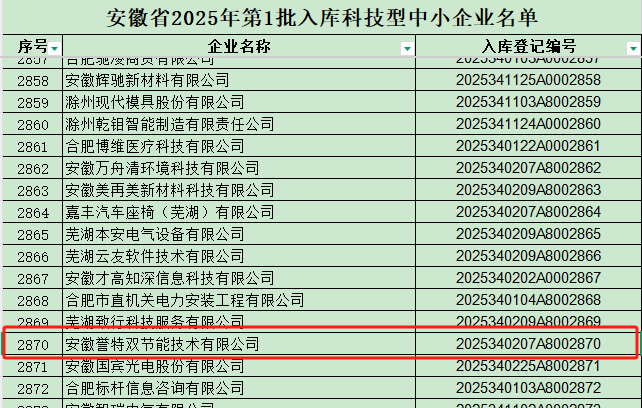 近日,安徽省科學(xué)技術(shù)廳公布了2025年第一批入庫科技型中小企業(yè)名單,安徽譽特雙節(jié)能技術(shù)有限公司憑借其在節(jié)能技術(shù)領(lǐng)域的突出創(chuàng)新實力和豐富的技術(shù)積累,入選科技型中小企業(yè)庫,成為安徽省科技創(chuàng)新主力軍中的一員。