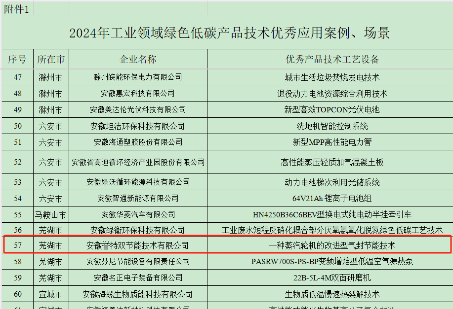 近日,安徽省工信廳為推進(jìn)新型工業(yè)化,加強(qiáng)工業(yè)領(lǐng)域綠色低碳技術(shù)、裝備、產(chǎn)品的推廣應(yīng)用,引導(dǎo)制造業(yè)綠色化發(fā)展,發(fā)布了2024年以來(lái)一批綠色低碳產(chǎn)品技術(shù)應(yīng)用推廣服務(wù)的優(yōu)秀案例與場(chǎng)景,并引導(dǎo)和支持有關(guān)企業(yè)加強(qiáng)供需對(duì)接和應(yīng)用,助力工業(yè)綠色低碳發(fā)展,其中我公司"一種蒸汽輪機(jī)的改進(jìn)型氣封節(jié)能技術(shù)"入選工業(yè)領(lǐng)域綠色低碳技術(shù)推廣目錄。